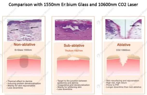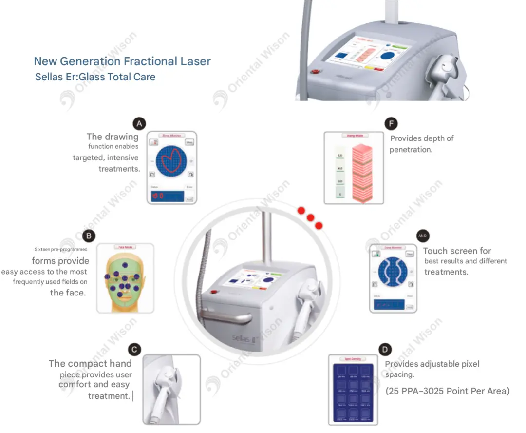 Het is een niet-invasief Er: glaslasersysteem met een golflengte van 1550 nm. De golflengte van 1550 nm brengt thermische pulsen diep in de huid door via de epidermis, waar ze worden geabsorbeerd door het water in het weefsel en leiden tot hoge temperaturen in het weefsel. Het weefsel wordt zachtjes verwarmd en resulteert in de afbraak van de cellen, terwijl het huidoppervlak onbeschadigd blijft.