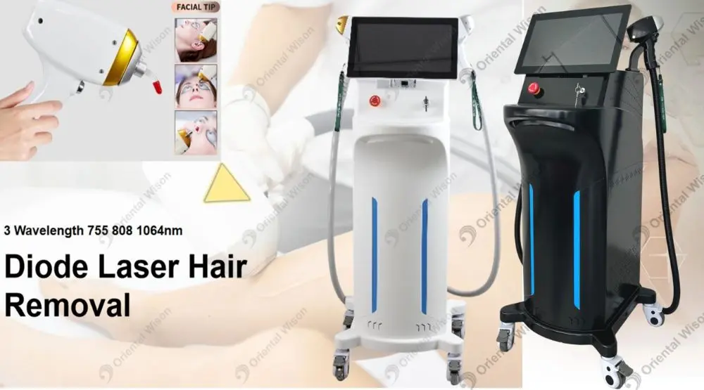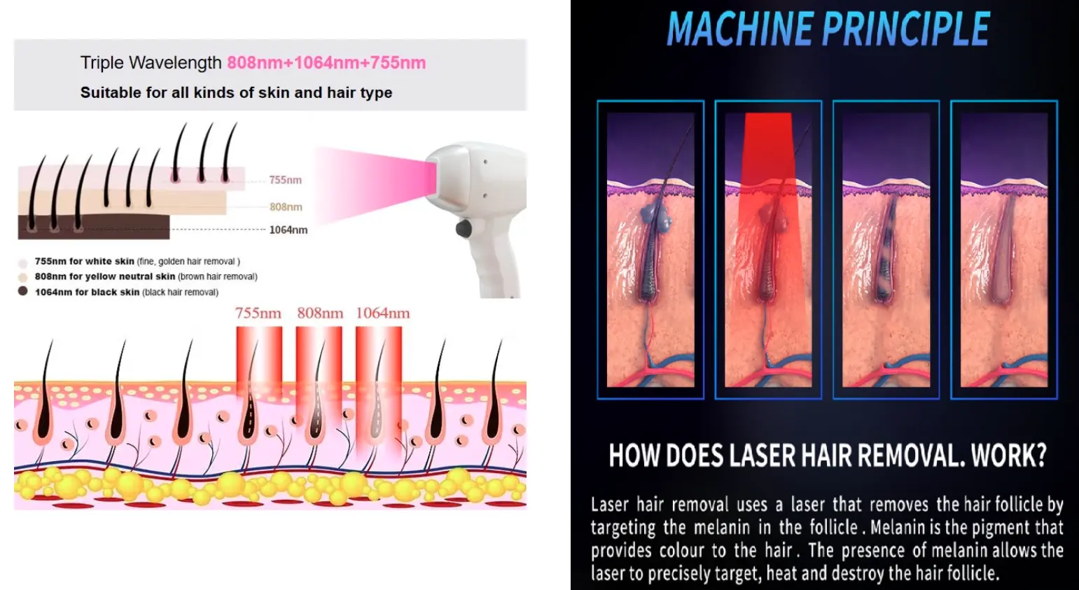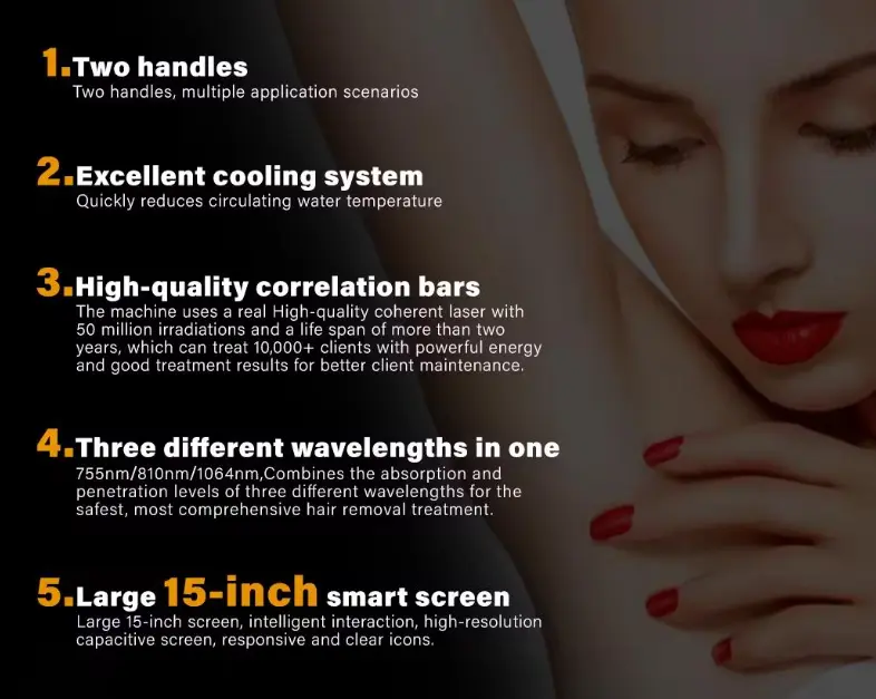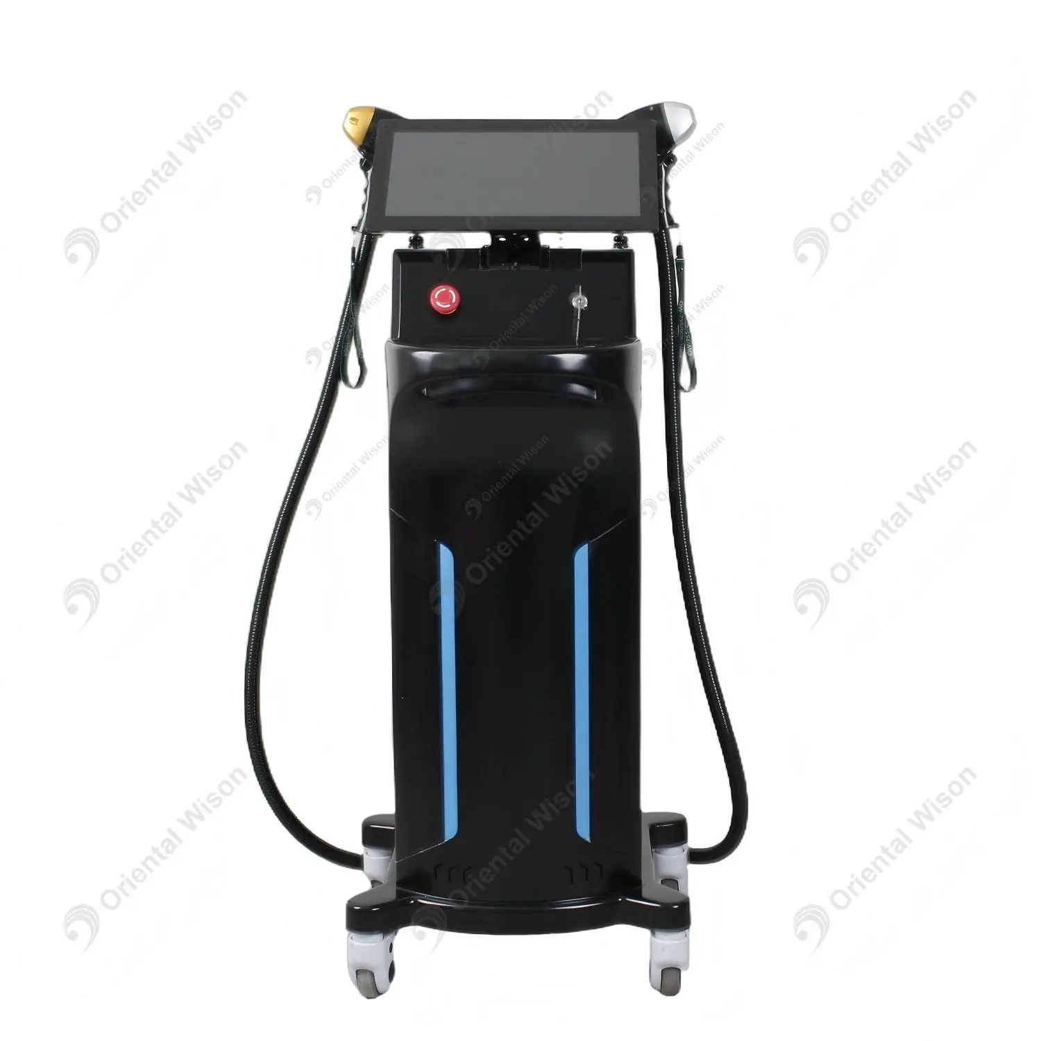 Dubbele handgreep 755 808 1064 diode laser ontharing Doelen melanine in haarzakjes met geconcentreerd licht. De laser zendt specifieke golflengten uit die zijn geabsorbeerd door pigment, verwarmt en beschadigt de follikel om hergroei te remmen. 755 nm Pakken Fair Skin met donker haar, 808 nm Balance Efficacy voor de meeste huidtypen, terwijl 1064 Nm veiliger is voor een donkere huid (Fitzpatrick IV-VI). Omringende huid blijft beschermd via koelsystemen. Meerdere sessies zorgen voor permanente vermindering.