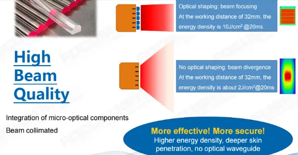 Superieure straalkwaliteit: Door de divergentie van elke laserdiode te verkleinen, wordt de straal nauwkeuriger, waardoor snellere behandelingen en een grotere werkzaamheid mogelijk zijn.